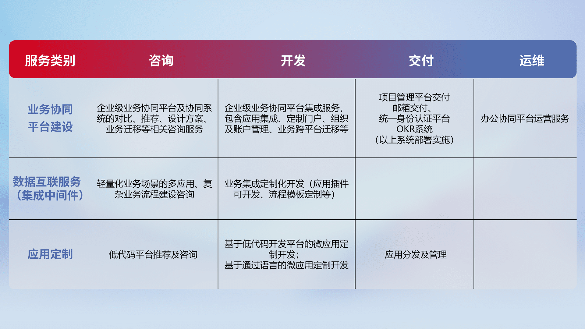 针对钉钉、、、企微、、IDaas等平台级产品提供产品的规划、、、方案、、交付、、、、定制化开发等服务,,,实现如统一协同办公、、、智能客户服务、、混合会议管理、、、智能数据查询、、、等业务场景,,,,实现数字化转型。。
