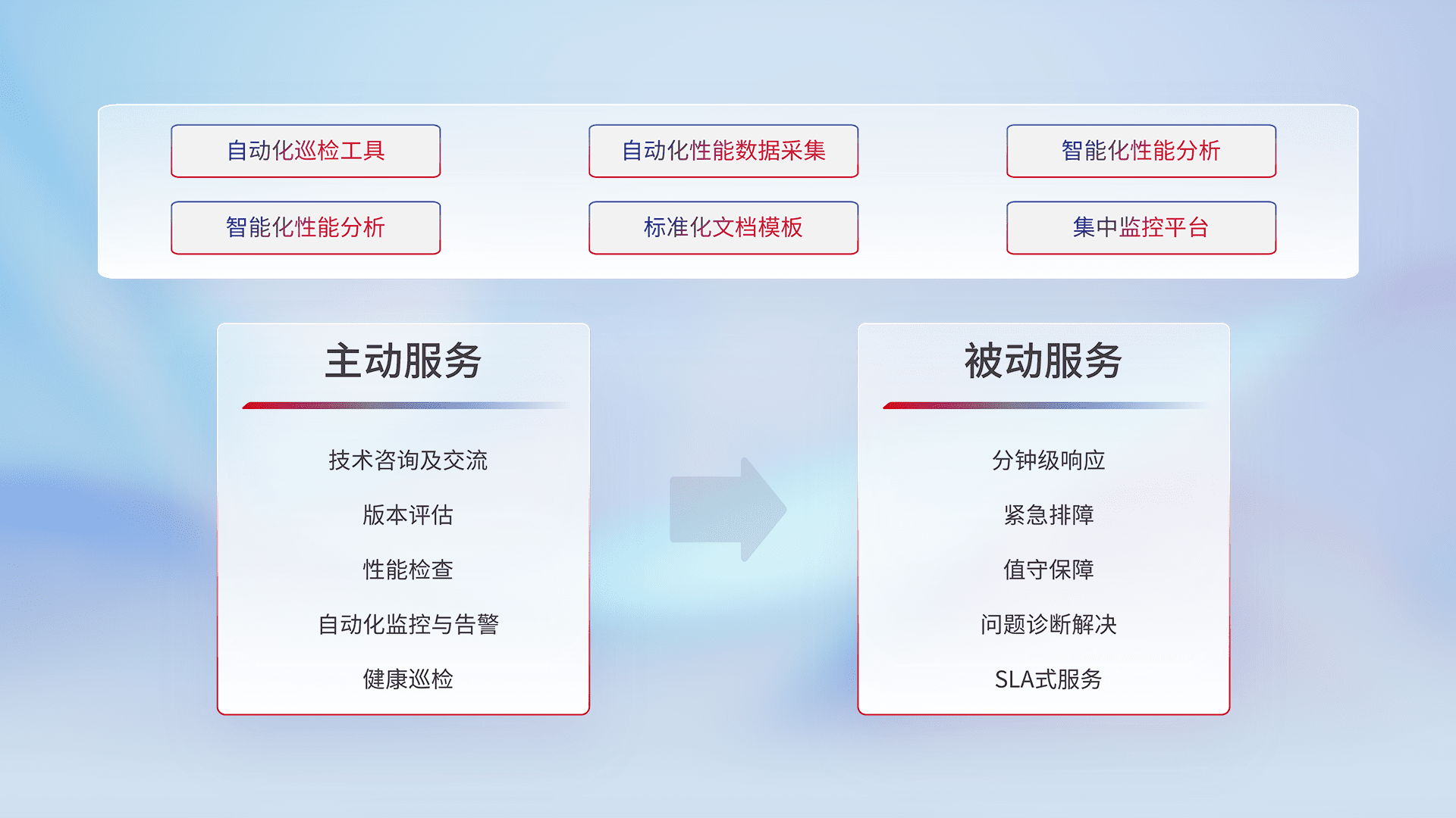 智能化工具和标准化文档,,,,保障服务质量,,,,提供主动服务(包含技术咨询、、、、版本评估、、、性能检查、、、、自动化监控与告警、、、、健康巡检)和被动服务包含(分钟级响应、、、、紧急排障、、、值守保障、、、问题诊断解决、、SLA服务)。。。
